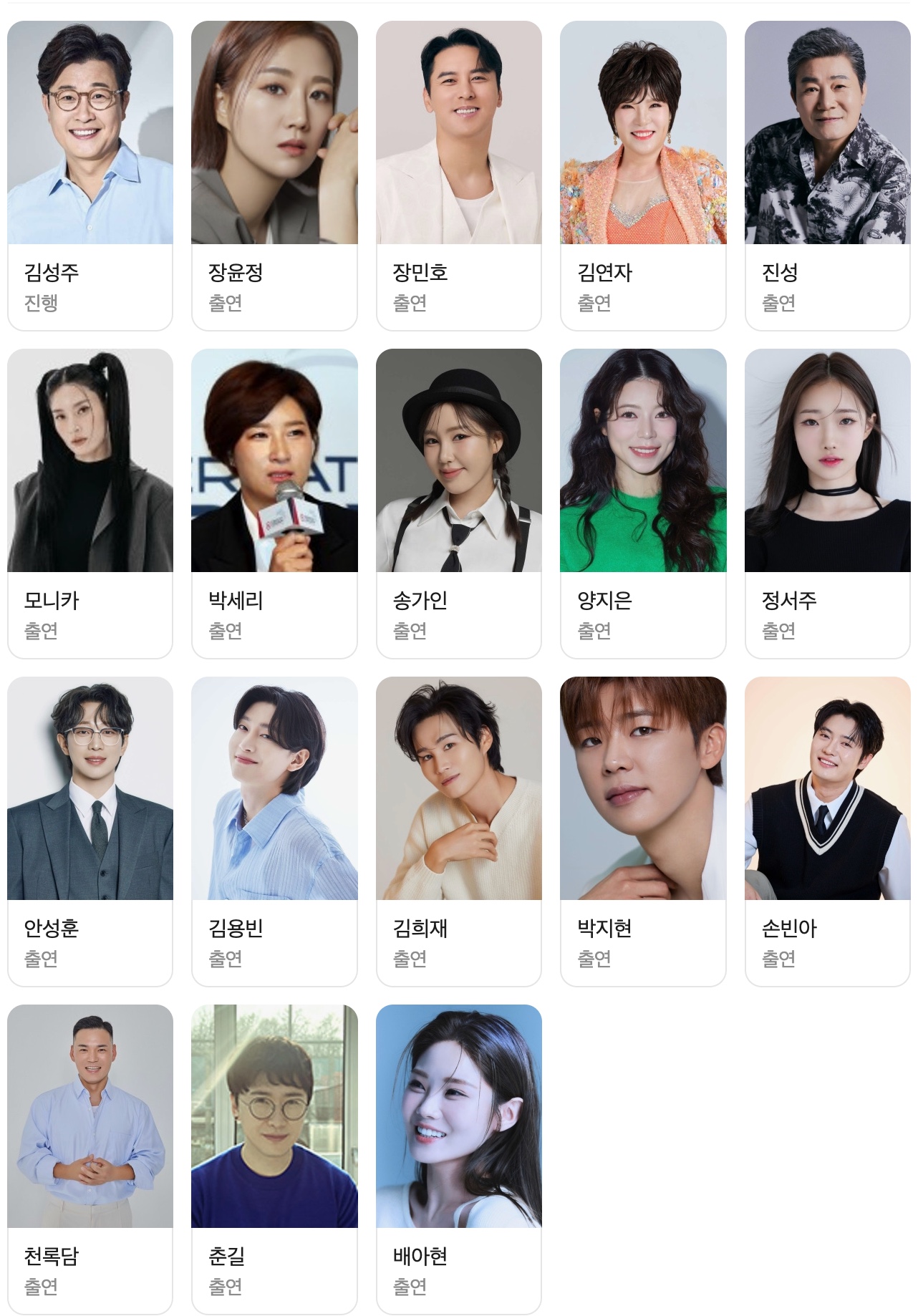 진행은 믿고 보는 MC 김성주가 맡고, 심사와 무대에 함께할 출연진으로는 장윤정, 장민호, 김연자, 진성, 모니카, 박세리, 송가인, 양지은, 정서주, 안성훈, 김용빈, 김희재, 박지현, 손빈아, 천록담, 춘길, 배아현 등이 이름을 올렸어요.