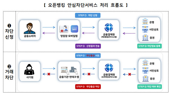 | 1 | 본인인증 후 내 계좌 보유 금융회사 확인 | 신분증 지참, 창구에서 ‘오픈뱅킹 안심차단’ 신청 |