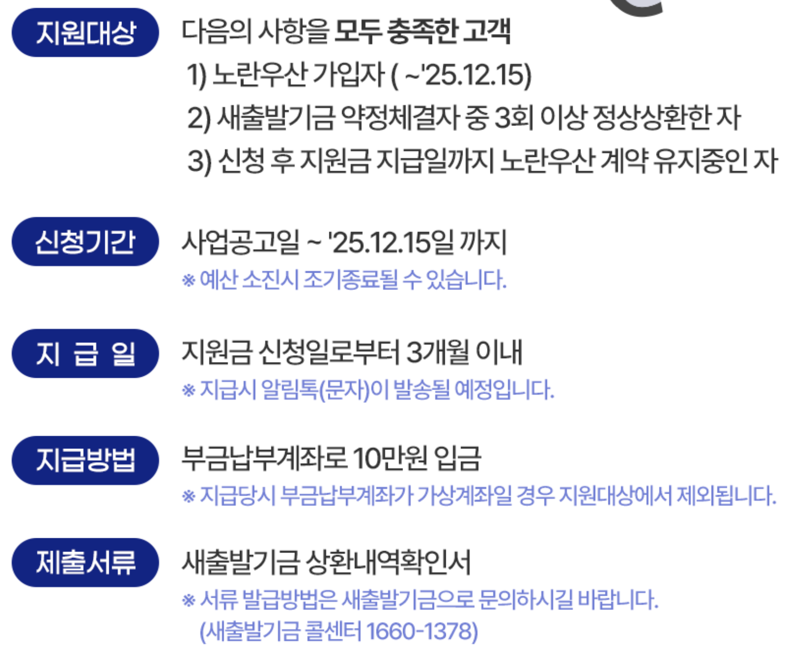 | 지원대상 | ① 노란우산 가입(~’25.12.15) ② 새출발기금 약정 후 3회 이상 정상상환 ③ 지급일까지 노란우산 유지 |