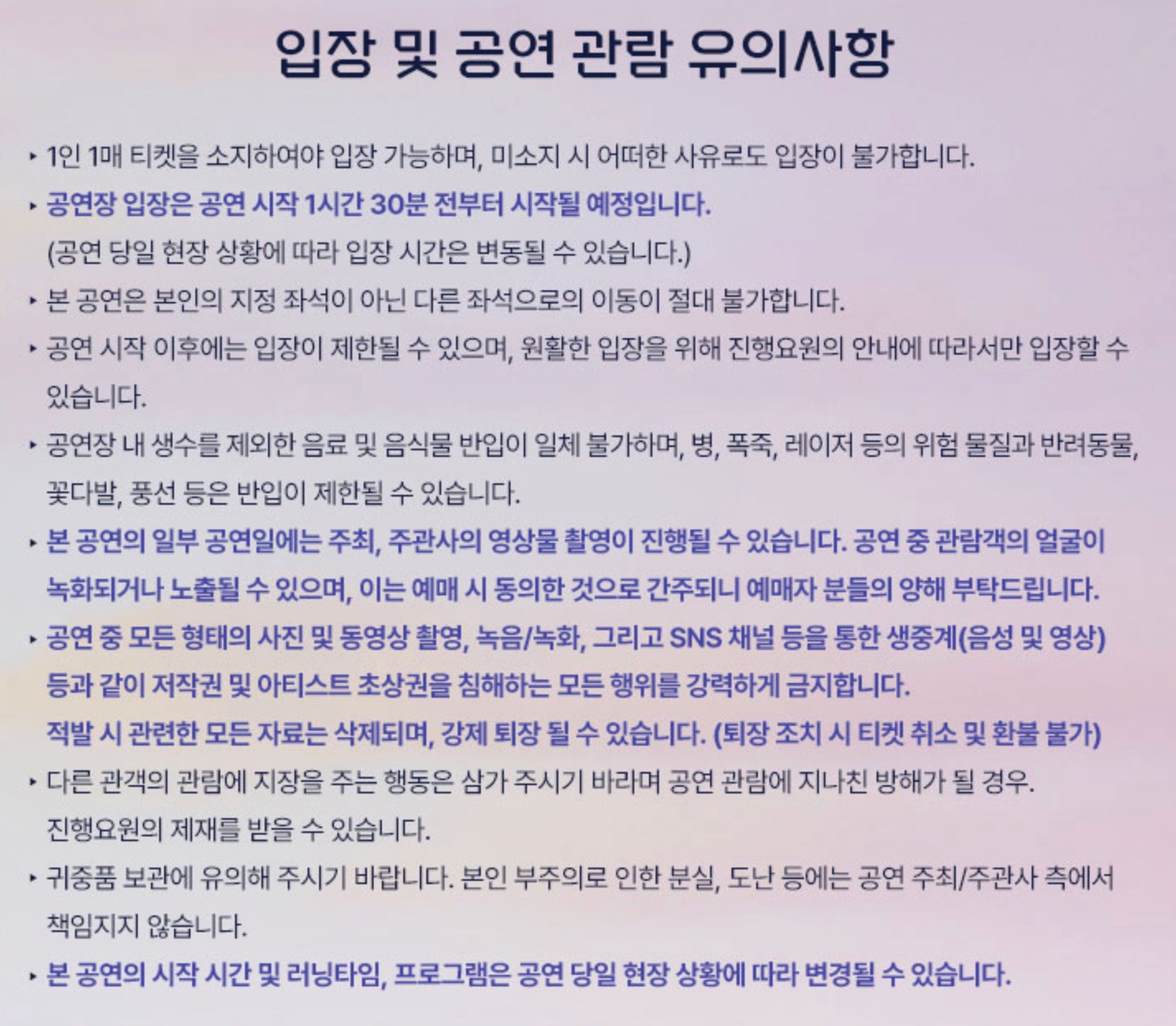 1인 1매 티켓을 소지해야만 입장 가능하고, 미지참 시 어떤 사유로도 입장이 어렵습니다. 공연 시작 이후에는 한 번에 많은 인원이 움직이면 안전 문제가 생길 수 있어서, 진행요원의 안내에 따라 순차적으로 입장해야 하고, 늦게 들어가면 앞 곡들을 놓칠 수도 있어요.