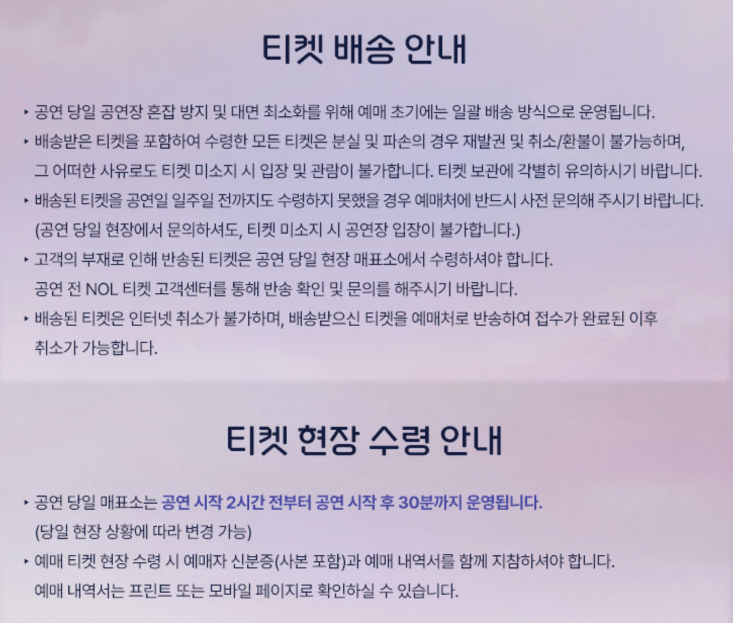 Q.티켓을 분실했을 때는 어떻게 되나요?실물 티켓은 분실·훼손 시 재발급이 어려운 것이 원칙입니다. 예매처 고객센터에 문의해 보실 수는 있지만, 입장이 보장되지는 않으니 티켓 수령 후에는 별도 파일이나 지갑 등에 꼭 따로 보관해 두시는 걸 추천드립니다.