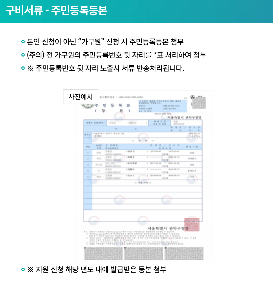 - 주민등록등본은 주민등록번호 마스킹 필수