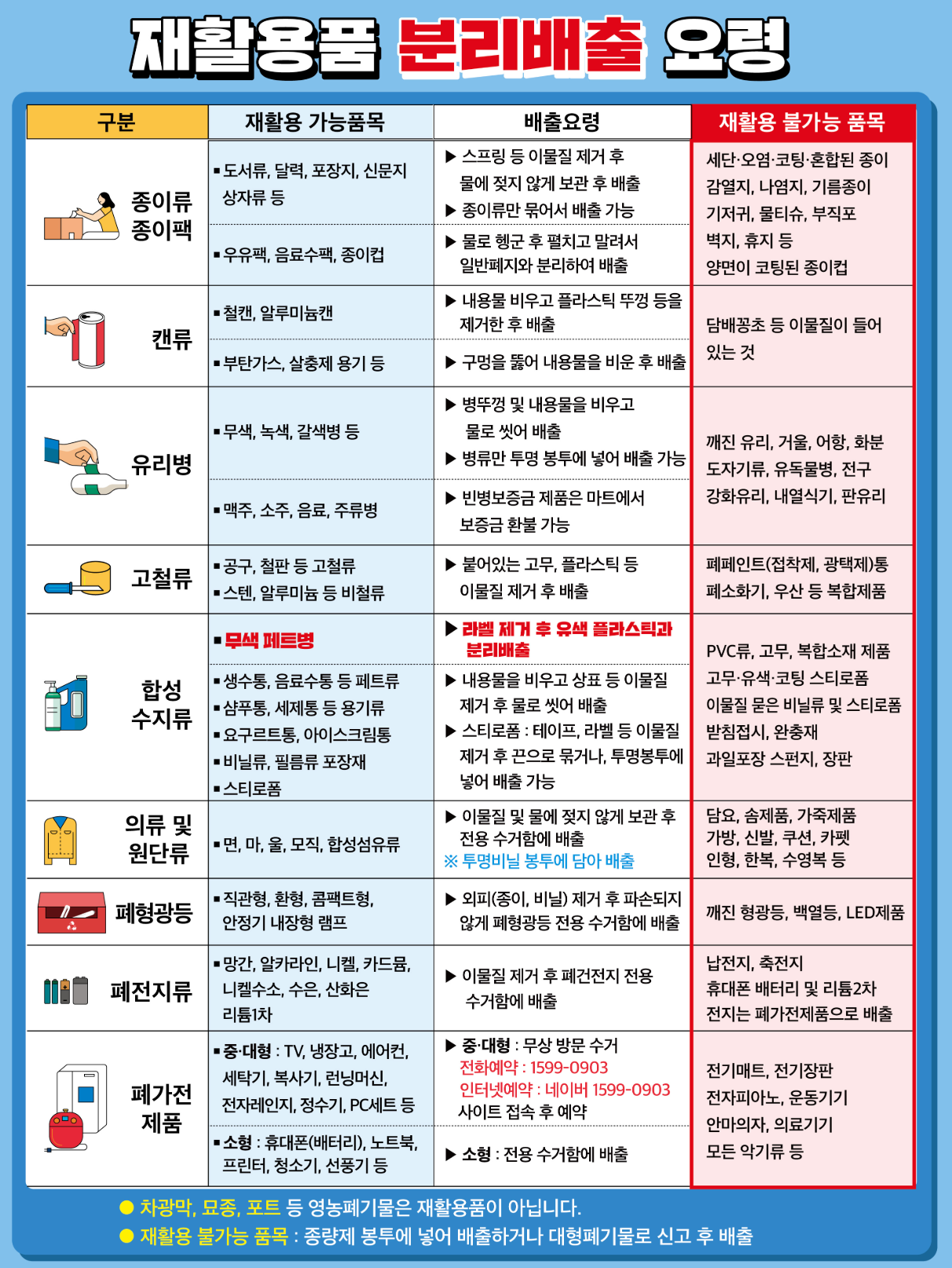 지역마다 다른 생활폐기물 분리배출 기준이 있을 수 있으니, 표는 일반 원칙 정도로 참고하시고 최종은 우리동네 페이지에서 확인하세요.