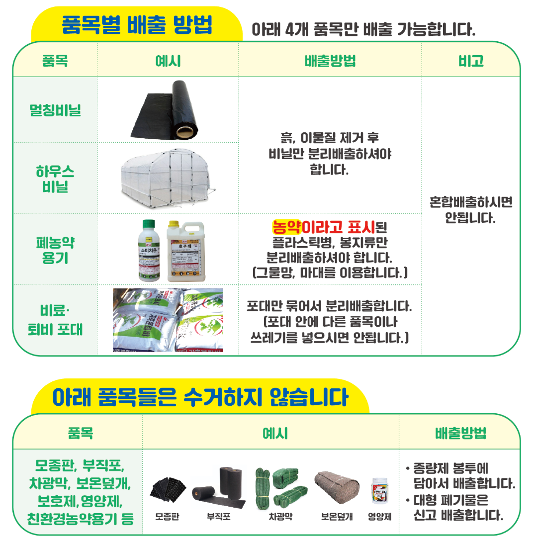 - 품목별 배출방법 : 생활폐기물 종류·재활용 품목별로 대상품목/배출방법/처리과정 설명.