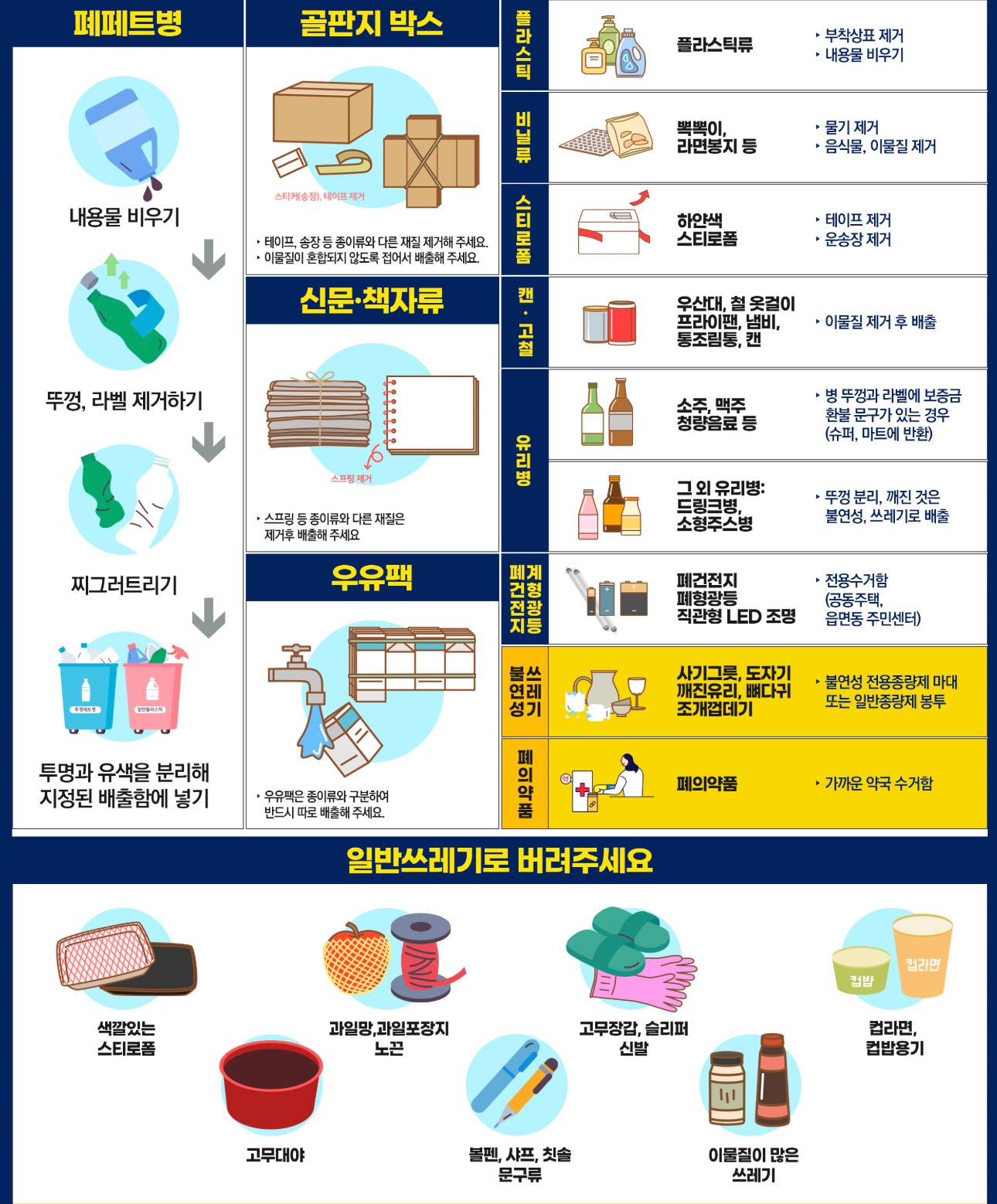 무색과 처리 경로가 다른 곳이 많습니다. 우리동네 기준을 확인하고 오염은 꼭 세척하세요.