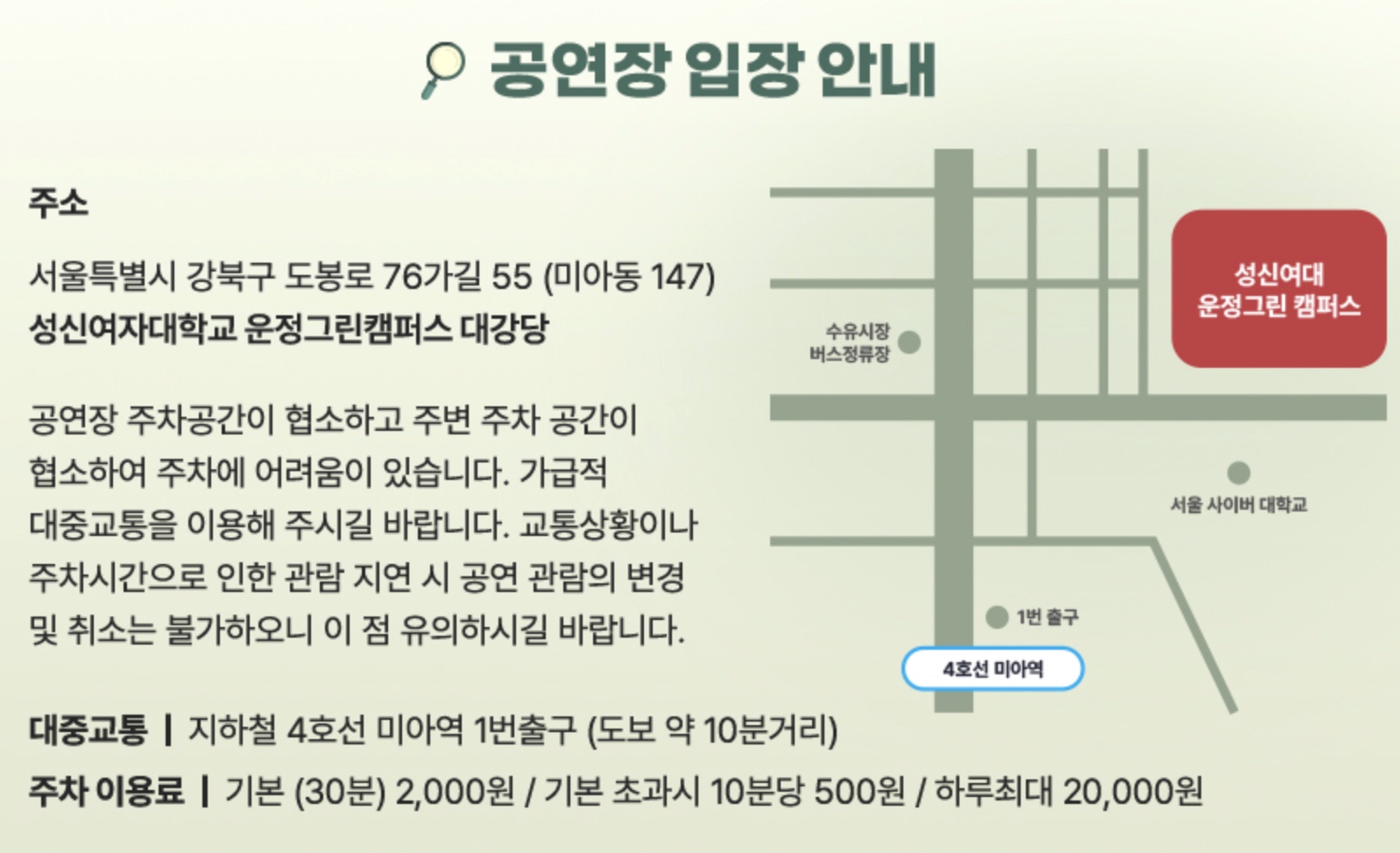포스터 기준으로 가장 추천되는 이동 방법은 지하철 4호선 미아역 1번 출구 이용입니다. 도보로 약 10분 정도 걸리는 거리라, 공연 당일에는 미리 길 찾아보기를 켜두시고 이동하시면 길을 헤맬 가능성이 줄어듭니다.