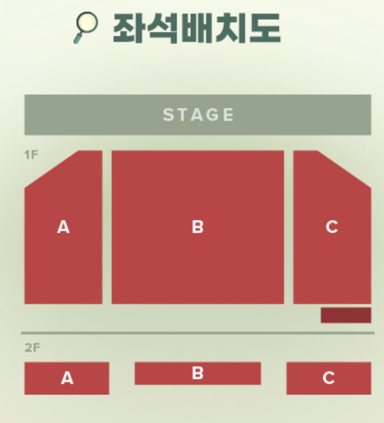 - 무대와 살짝 거리가 있어도 안정적인 시야를 선호한다면 2층 B구역 중간 라인