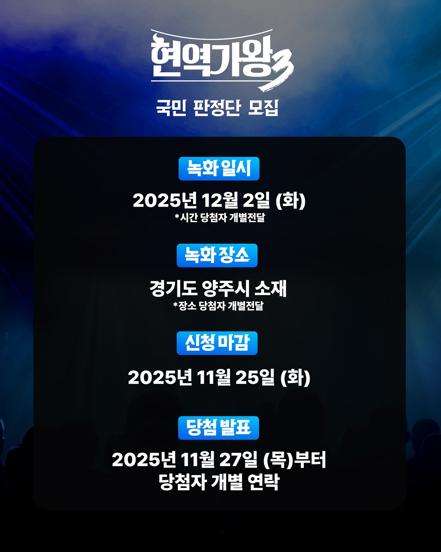 | 녹화장소 | 경기도 양주시 소재 (세부 주소는 당첨자에게 안내) |