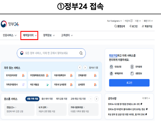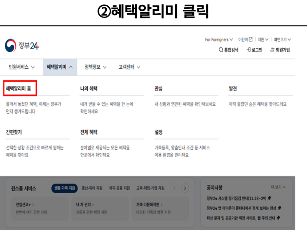 | ① 정부24 접속 | 정부24 메인 화면 | 정부24(plus.gov.kr 또는 gov.kr)에 접속 후 상단 메뉴에서 ‘혜택알리미’를 선택합니다. |
