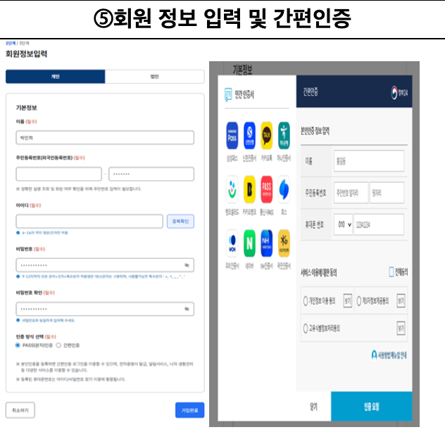 | ⑤ 회원 정보 입력 및 간편인증 | 기본 정보·본인인증 화면 | 이름·연락처 등 기본 정보를 확인하고, 민간 인증서·금융인증서를 이용해 본인인증을 진행합니다. |