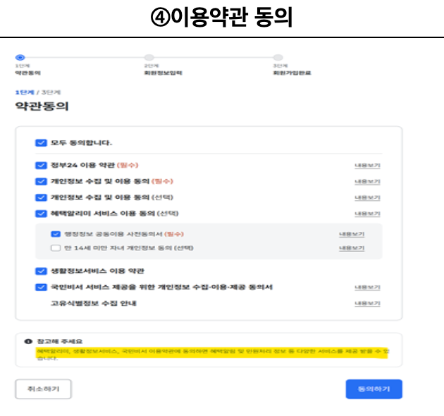 | ④ 이용약관 동의 | 약관 동의 화면 | 개인정보 이용, 공공서비스 정보 제공, 국민비서 알림 등 필수·선택 항목을 확인하고 동의합니다. |