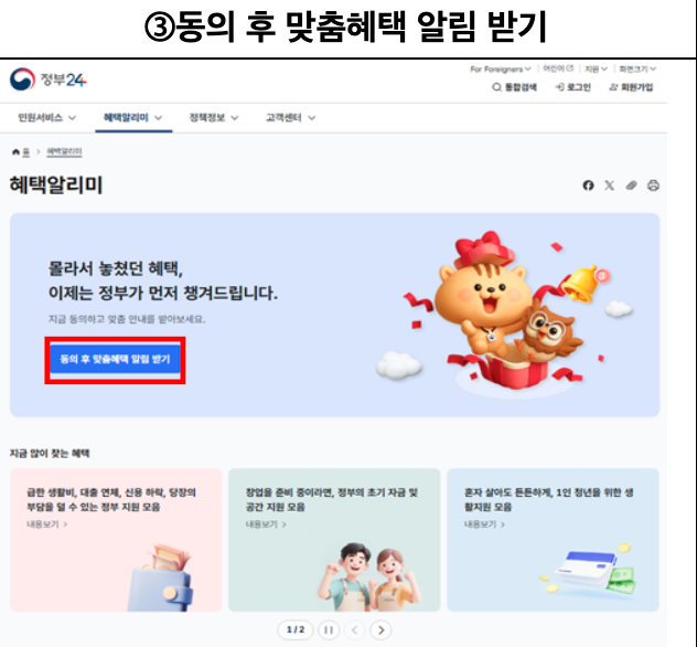 | ③ 동의 후 맞춤혜택 알림 받기 | 혜택알리미 시작 화면 | “맞춤형 혜택 알림 받기” 버튼을 눌러 본격적인 가입을 시작합니다. |
