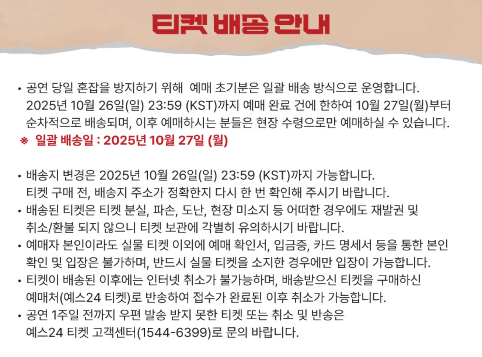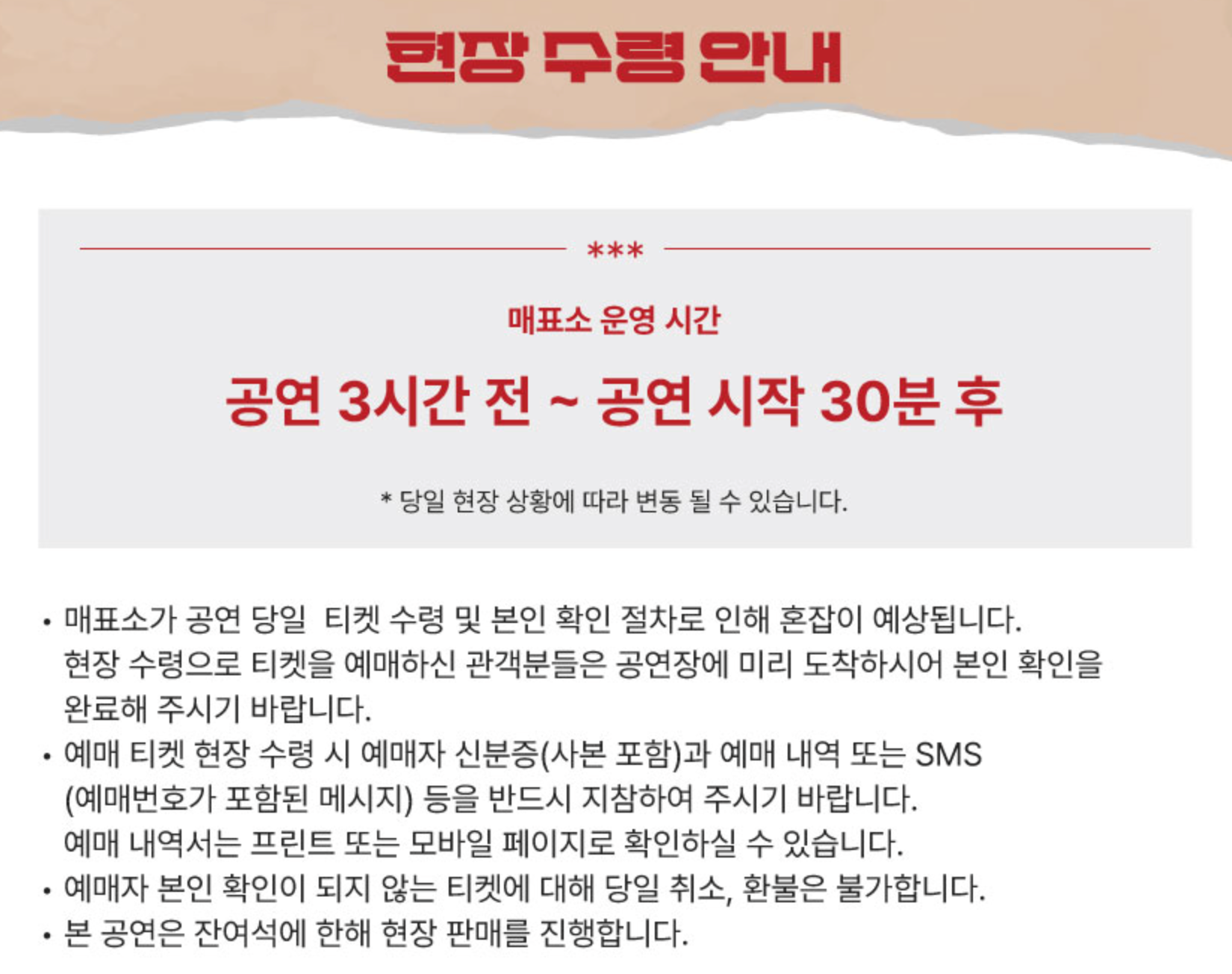 좌석·연출 변경, 일부 시야 제한은 공연 특성상 발생할 수 있으며, 이로 인한 당일 취소/변경/환불은 불가합니다.