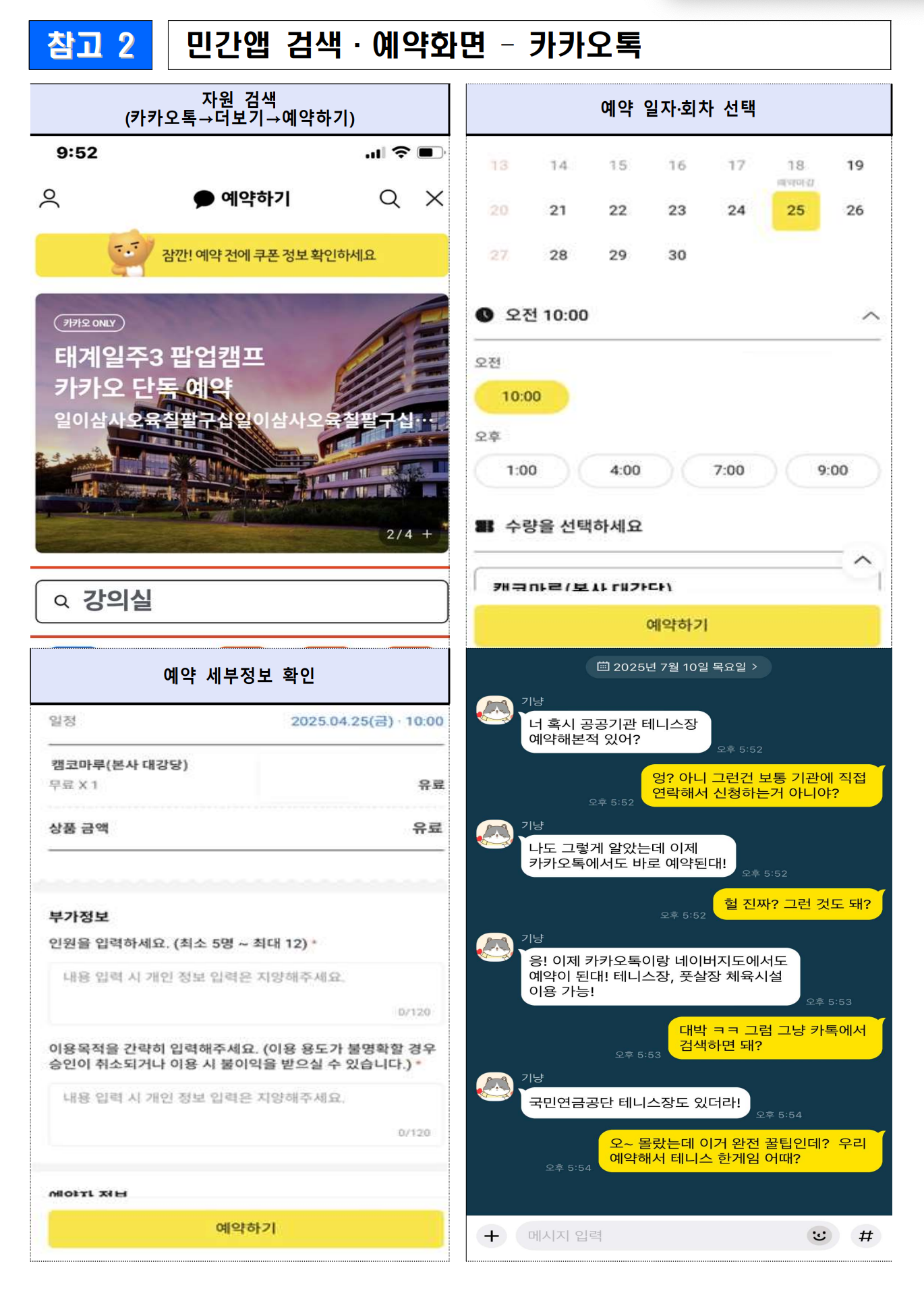 - 카카오톡: 하단 메뉴 ‘더보기’ → ‘예약하기’ 클릭 → 자원 검색 → 시간 선택 후 신청