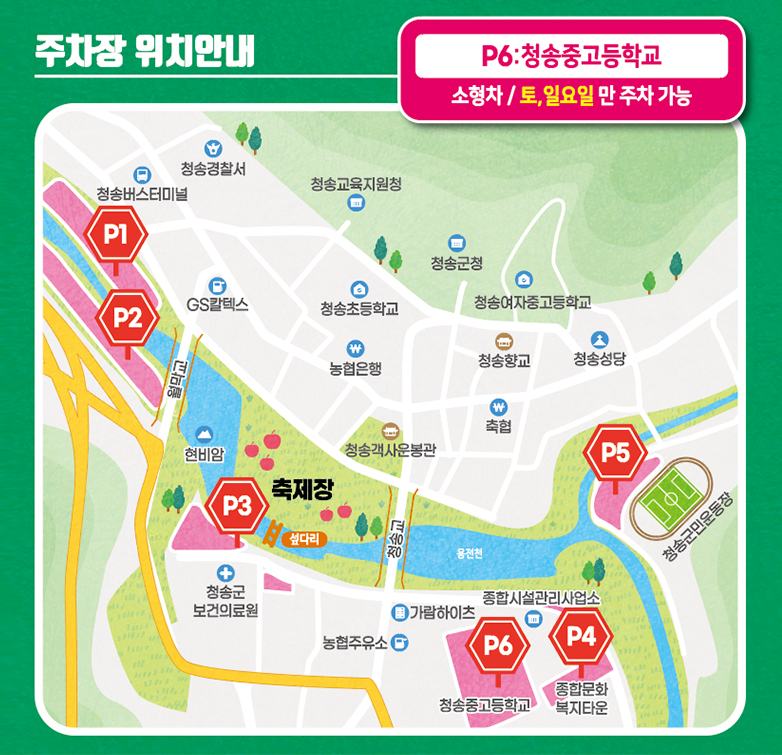 | 제5주차장 | 청송군민운동장 · 청송읍 중앙로 306-39 | 행사 후 출차 원활 |