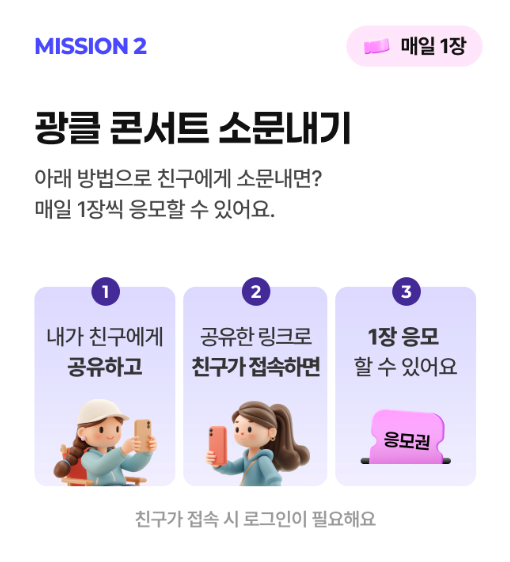 미션 2 | 콘서트 소문내기 (공유 링크를 통해 친구 접속 시) | 1장 (최대 11장) |
