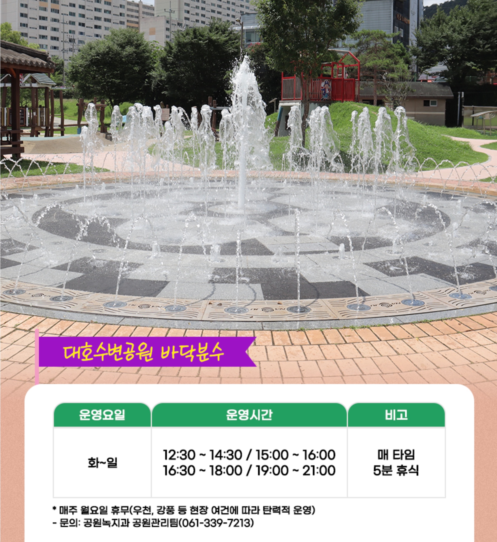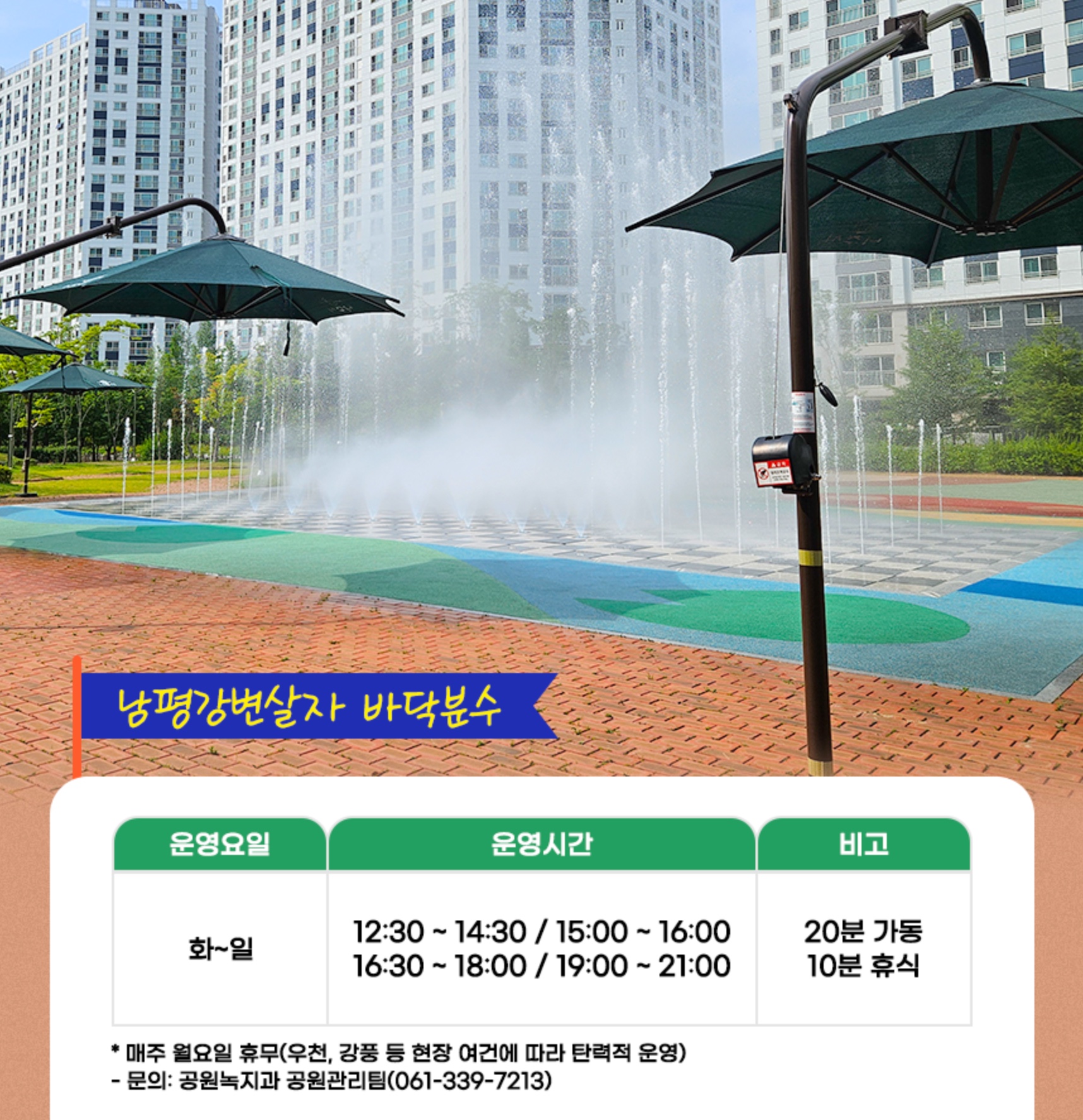 20분 가동 / 10분 휴식 | 공원녹지과 공원관리팀 (☎061-339-7213) |