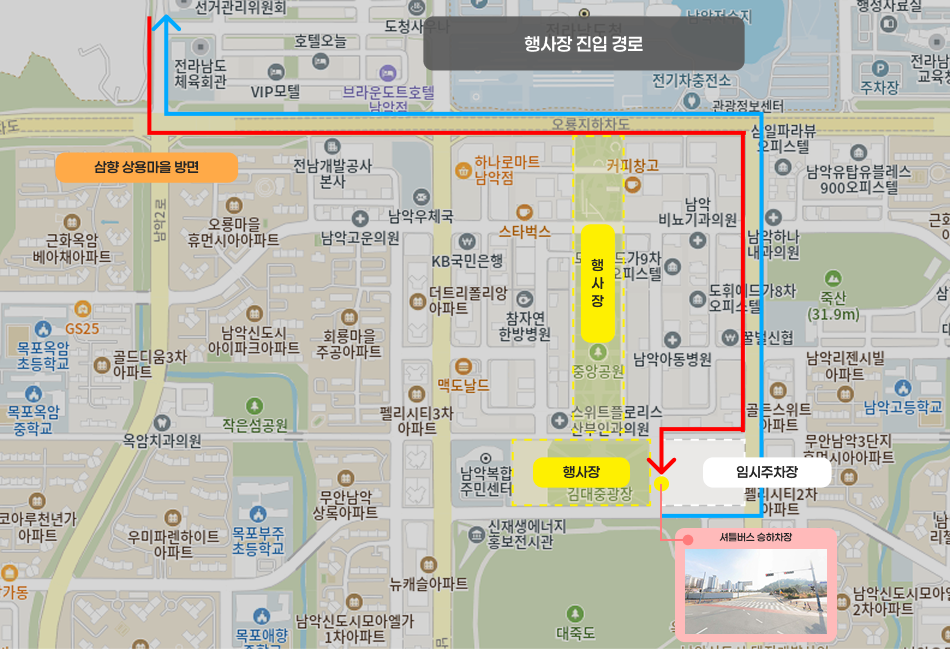 남악중앙공원은 접근성도 좋아요. 주차장이 잘 마련되어 있고, 무안군청 앞에서도 도보로 이동이 가능합니다. 이번에는 셔틀버스도 운영된다고 하니 대중교통 이용이 더 편리해질 것 같아요.