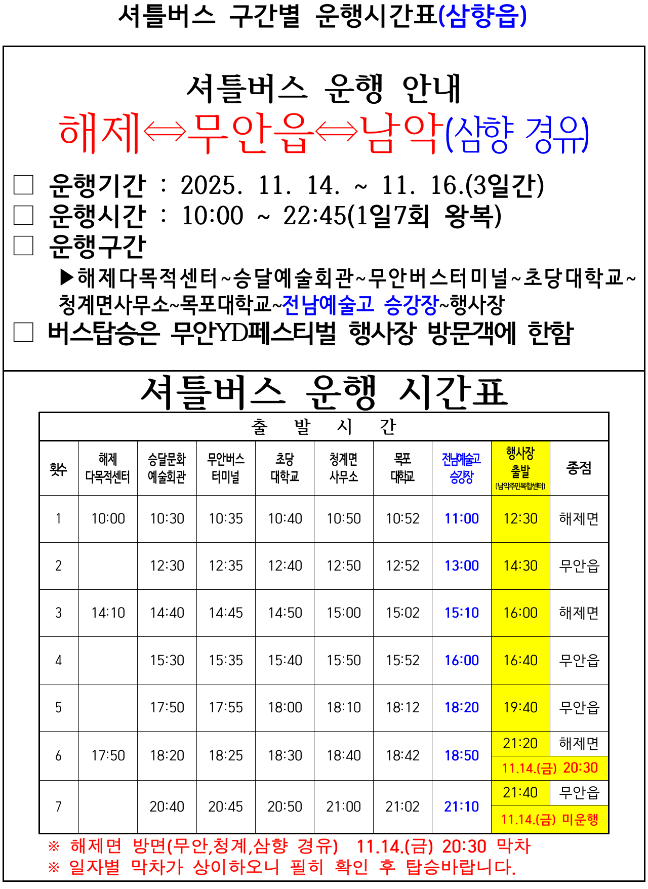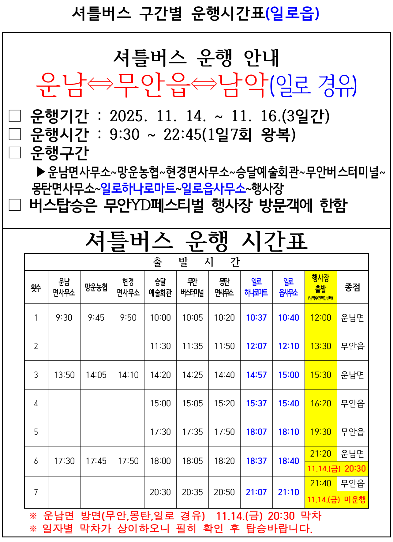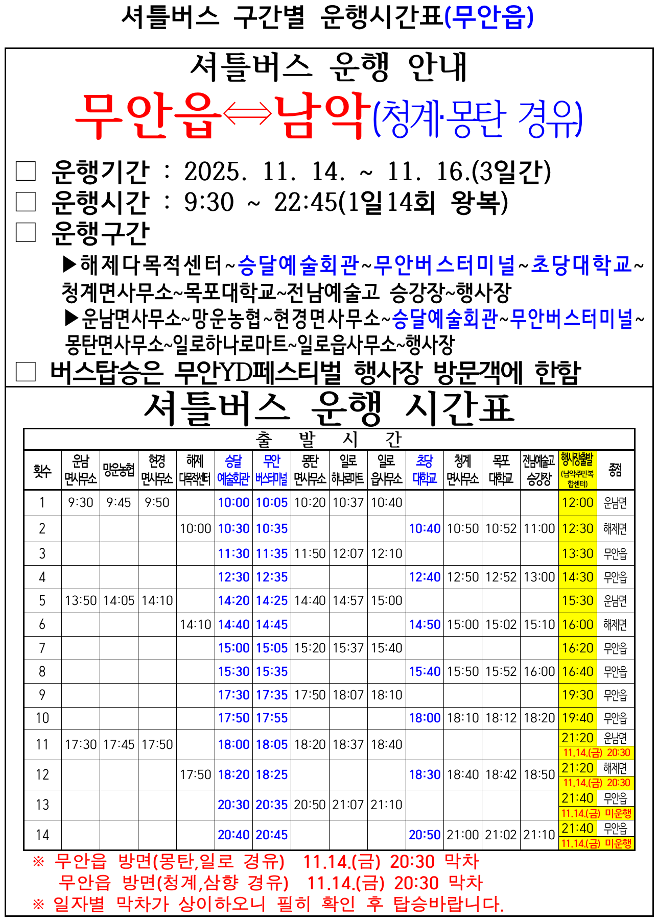 Q. 우천 시 일정은 어떻게 되나요?악천후가 아닌 이상 대부분 예정대로 진행됩니다. 취소·변경 시 무안군청 홈페이지와 SNS로 공지됩니다.