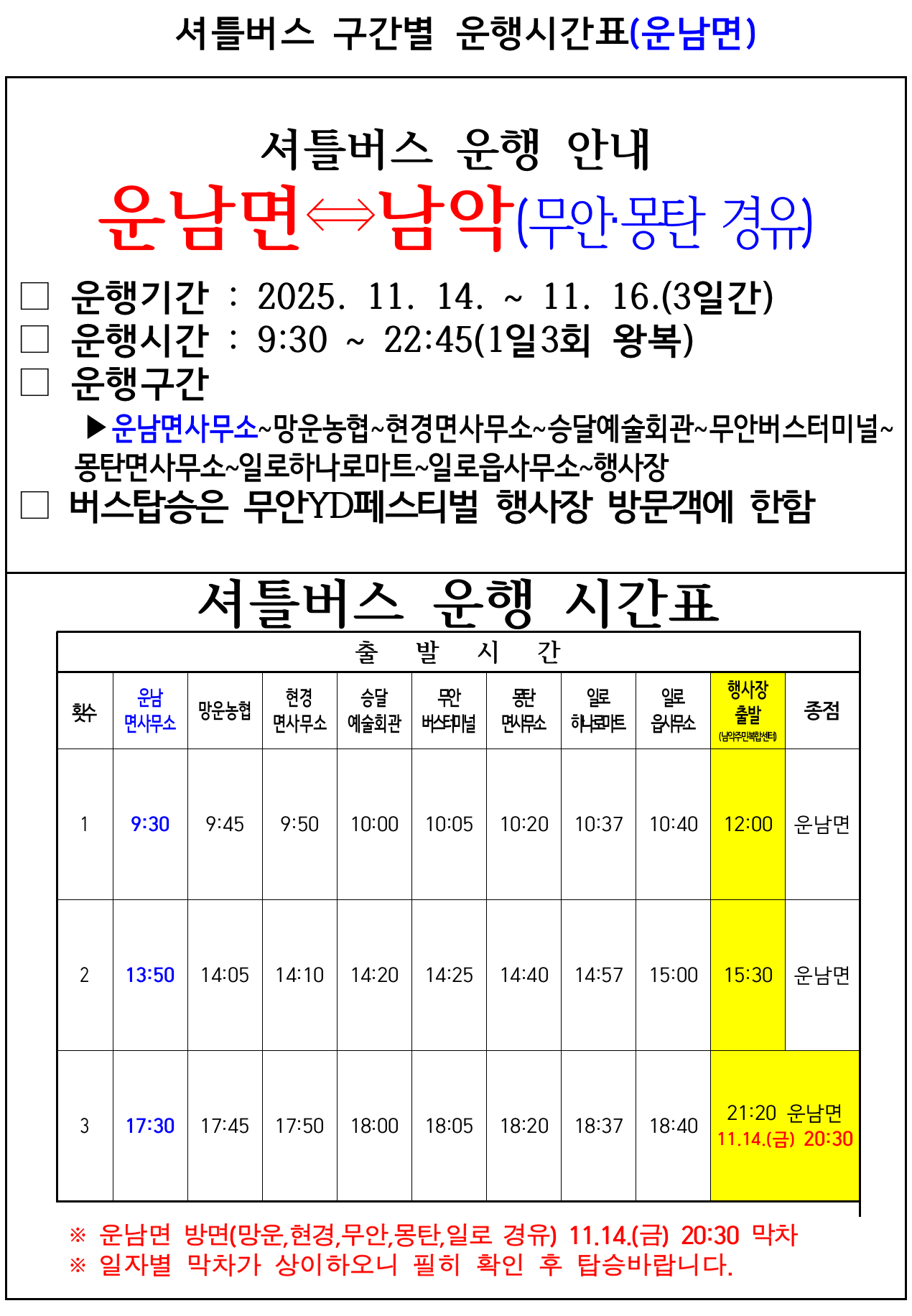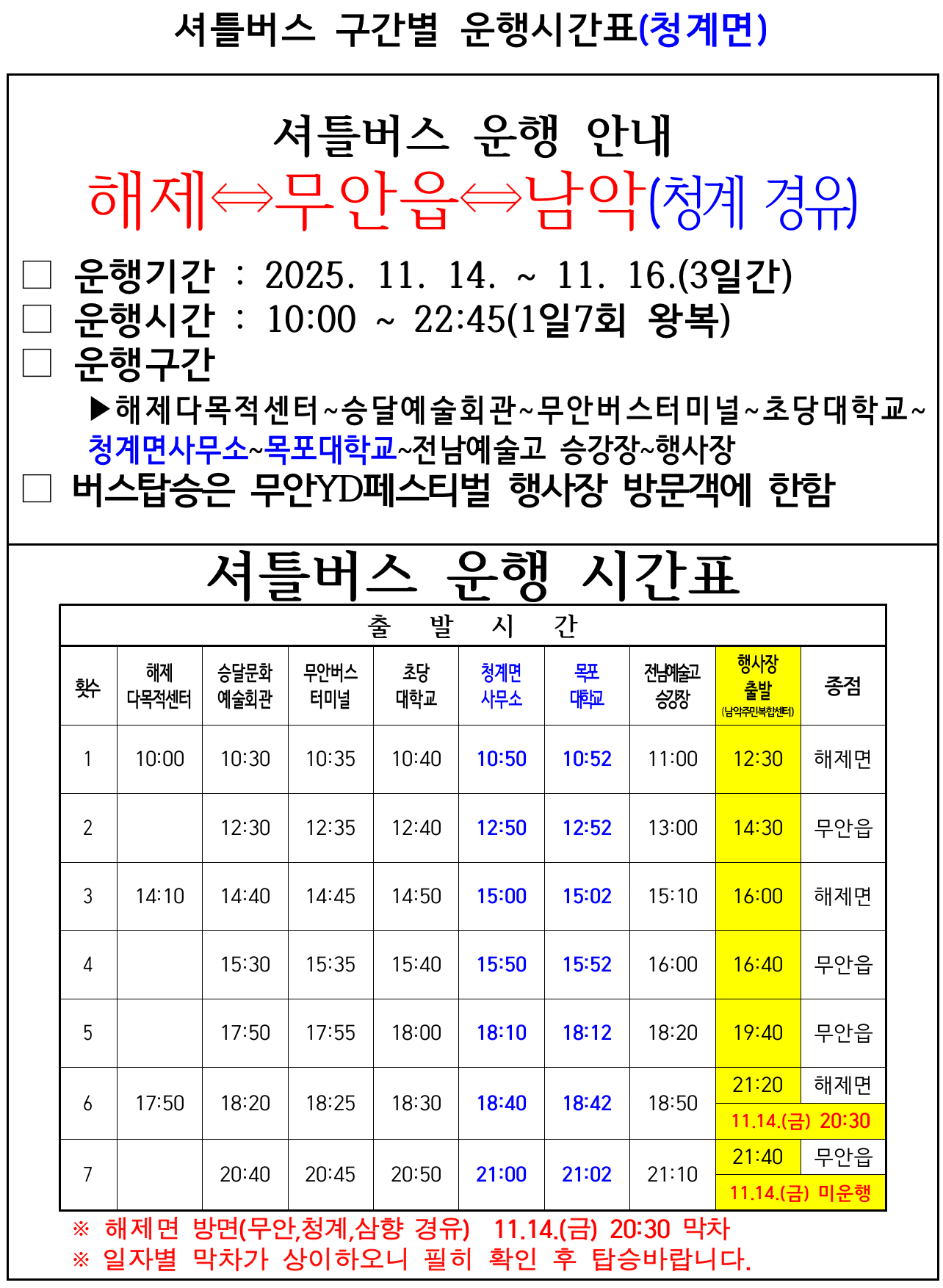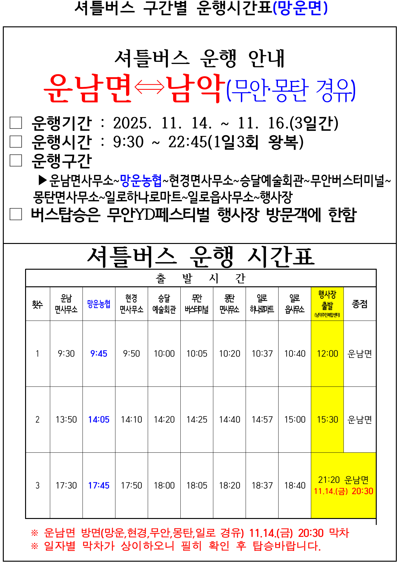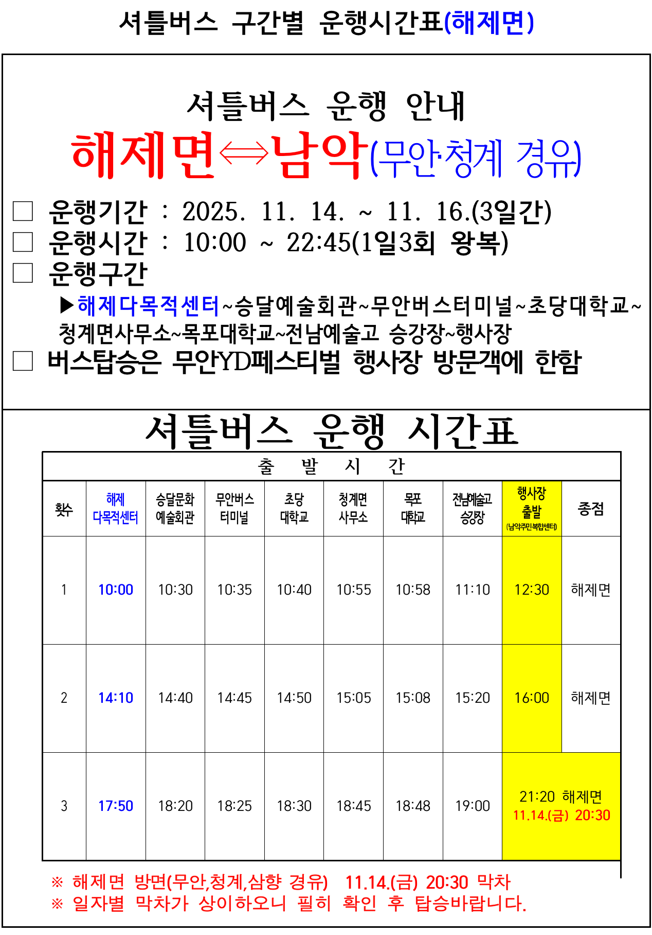 Q. 우천 시 일정은 어떻게 되나요?악천후가 아닌 이상 대부분 예정대로 진행됩니다. 취소·변경 시 무안군청 홈페이지와 SNS로 공지됩니다.