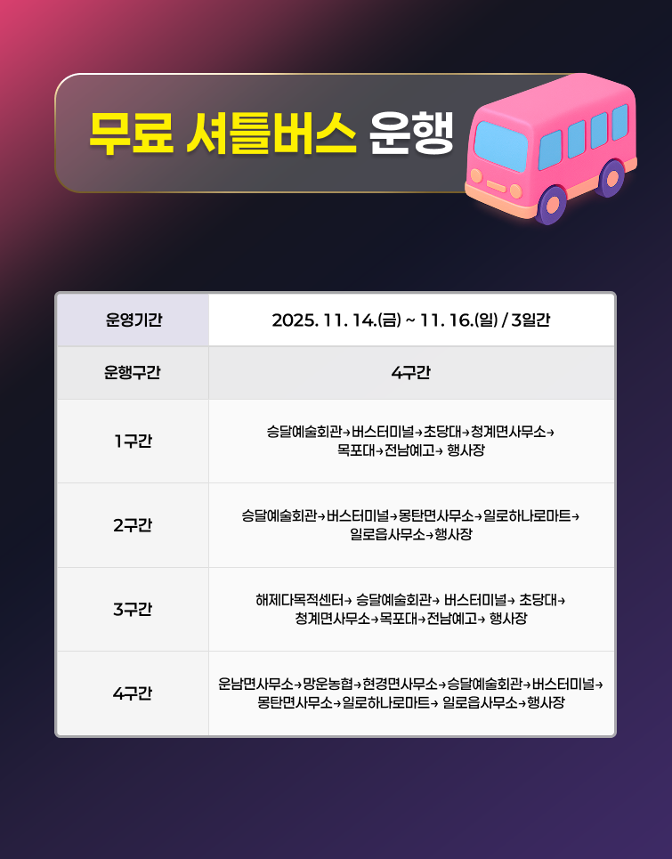 | 제5회 무안 YD페스티벌 2025 | 2025.11.14.(금) ~ 11.16.(일) | 전남 무안군 삼향읍 남악중앙공원 |