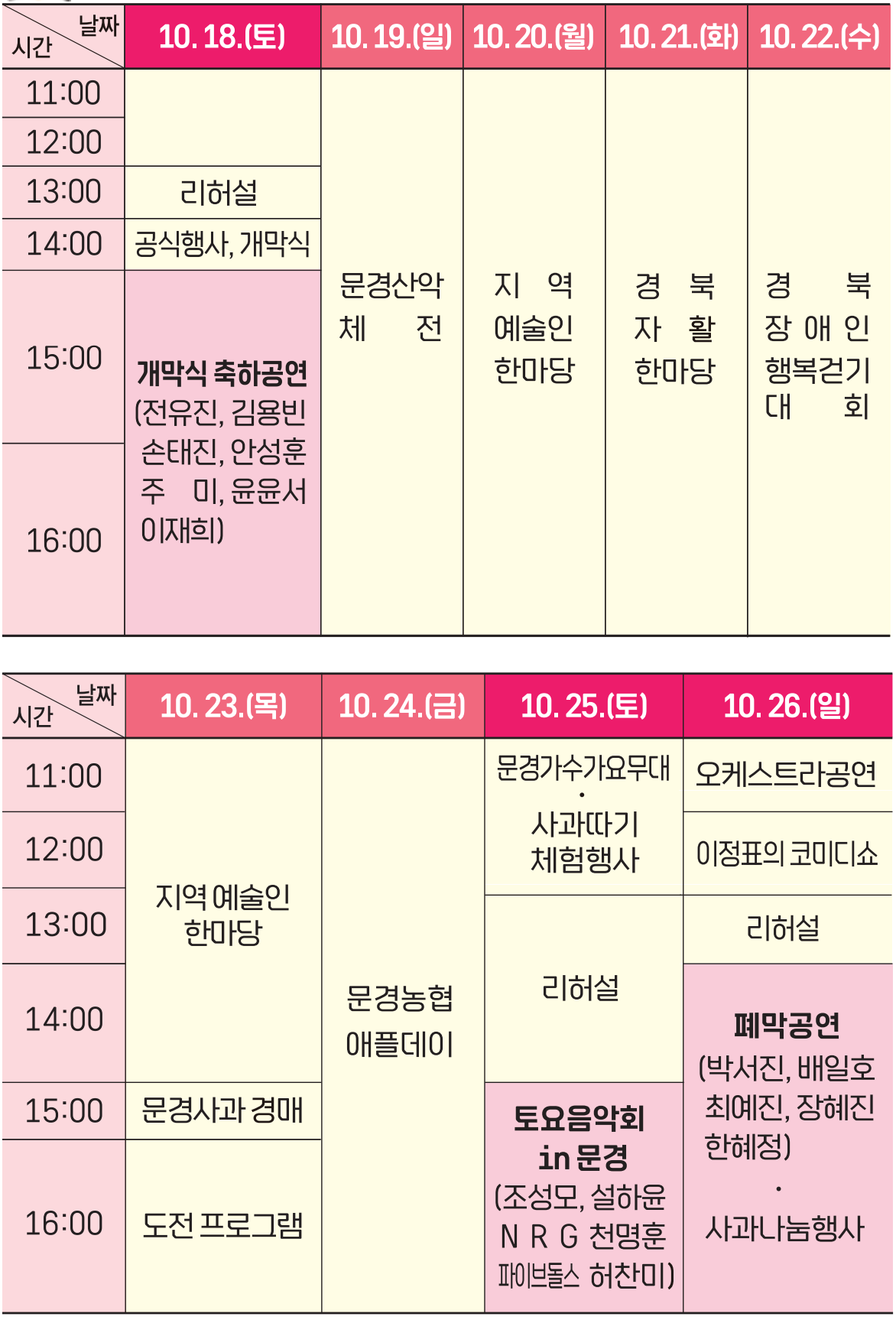 | 10.25.(토) | 15:00 | 토요음악회 in 문경 / 사과따기 체험행사 |