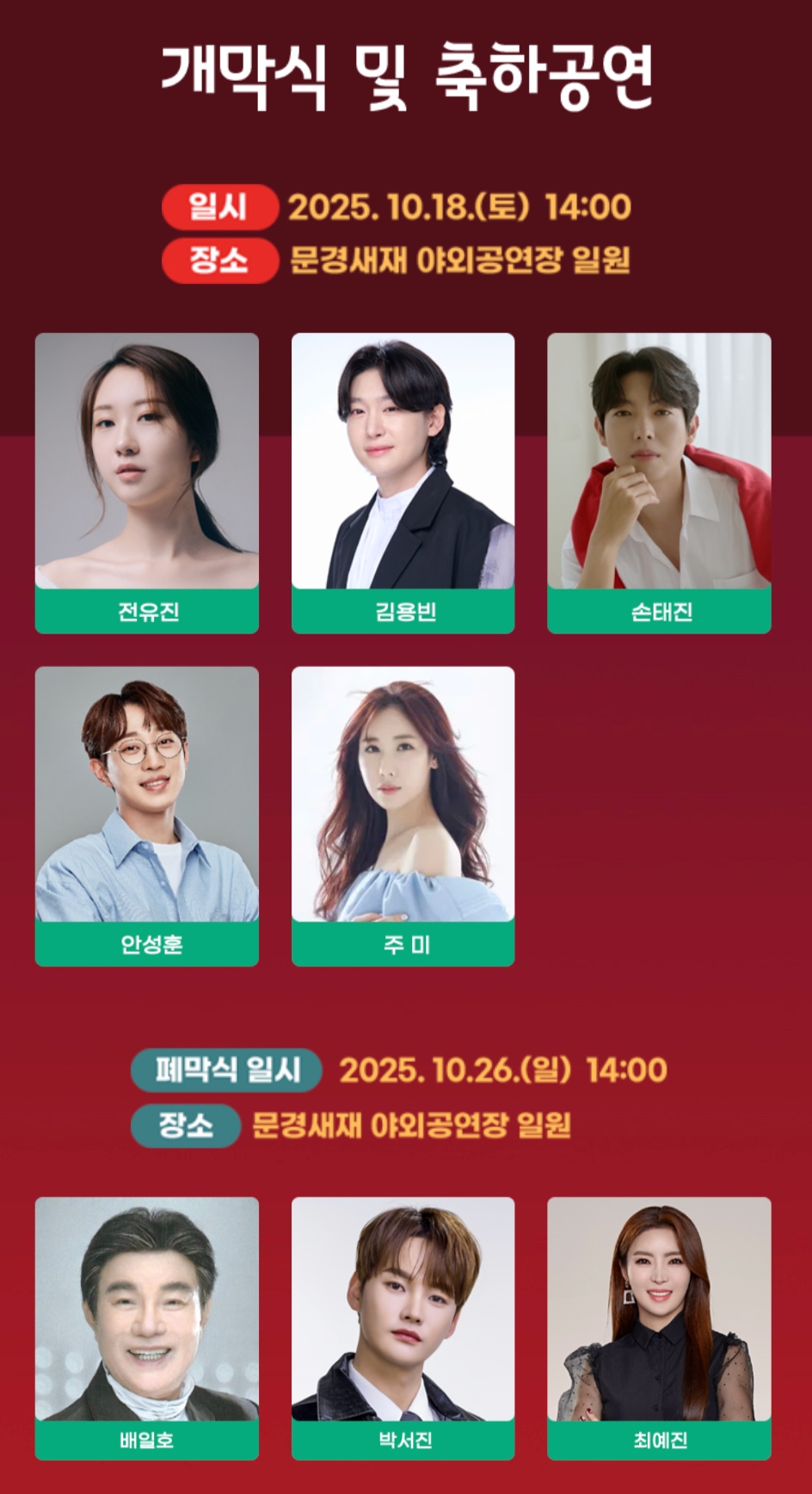 | 폐막식 공연 | 10.26.(일) 14:00 | 문경새재 야외공연장 | 박서진, 배일호, 최예진, 장혜진, 한혜정 |