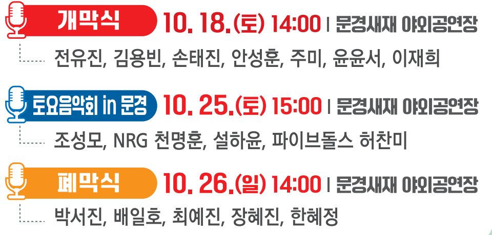 | 개막식 축하공연 | 10.18.(토) 14:00 | 문경새재 야외공연장 | 전유진, 김용빈, 손태진, 안성훈, 주미, 윤윤서, 이재희 |