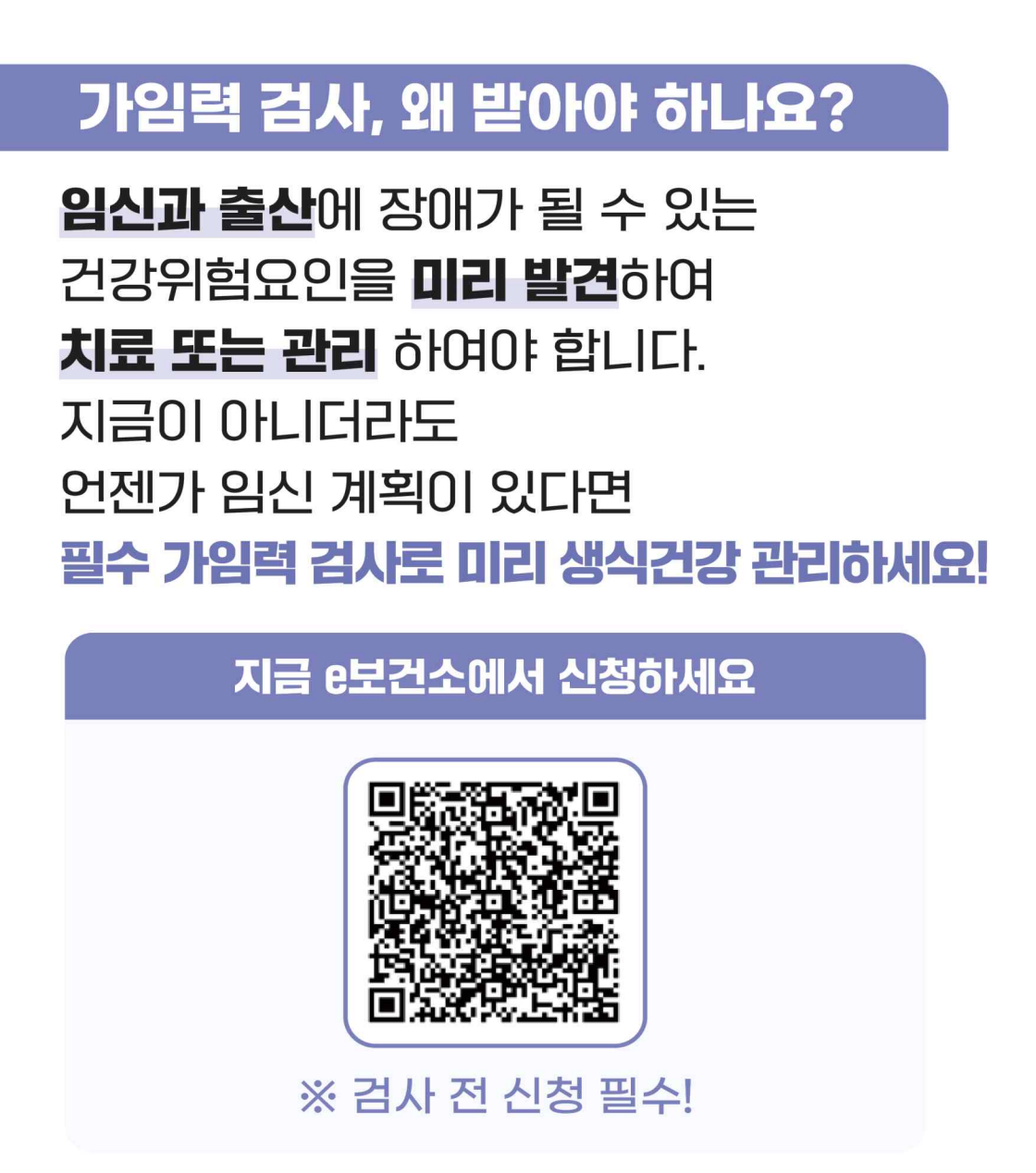 가임력 검사는 임신·출산에 영향을 줄 수 있는 위험요인을 미리 발견하고 관리하려는 목적입니다. 지금 임신 계획이 없어도 생활 습관을 점검하고 향후 선택지를 넓혀 준다는 점에서 의미가 커요.
