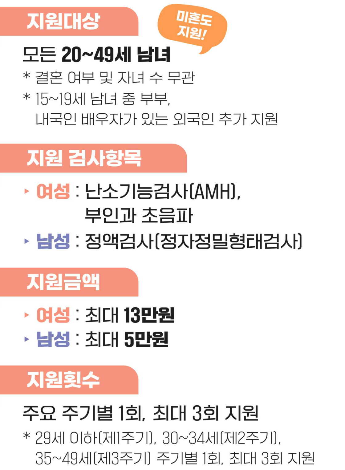 - 횟수 : 주기별 1회, 생애 최대 3회 (① 29세 이하, ② 30~34세, ③ 35~49세)