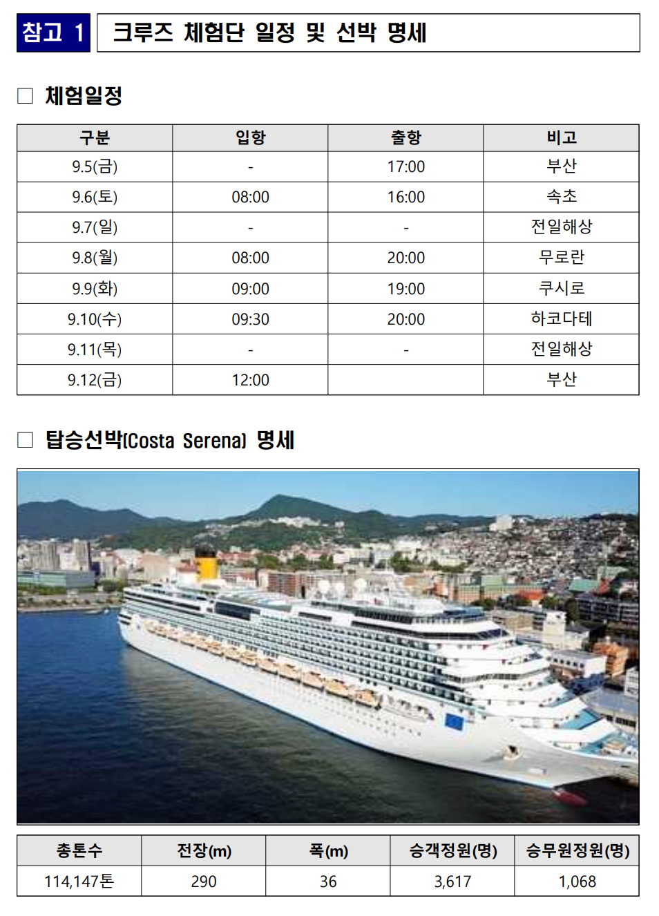 단, 과거 해수부 크루즈 체험단에 선정된 이력이 있는 경우 중복 신청 불가하며, 해외여행에 결격사유가 없어야 합니다.
