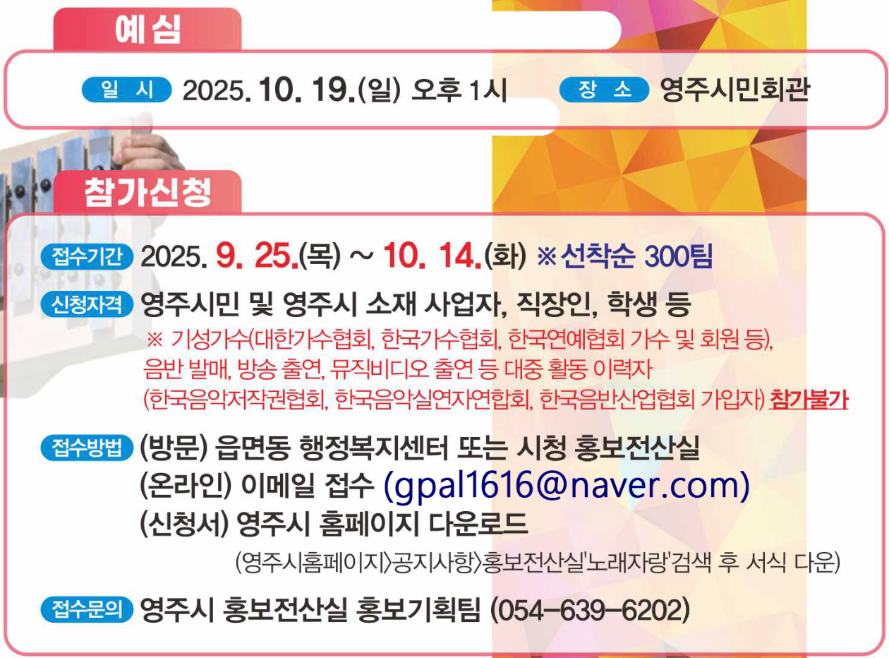 | 신청자격 | 영주시민 및 영주시 소재 사업자, 직장인, 학생 등 기성 가수, 음반 발매자, 방송·뮤직비디오 출연 경험자는 참가 불가 |