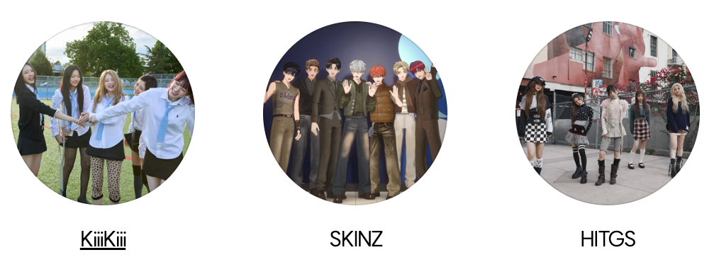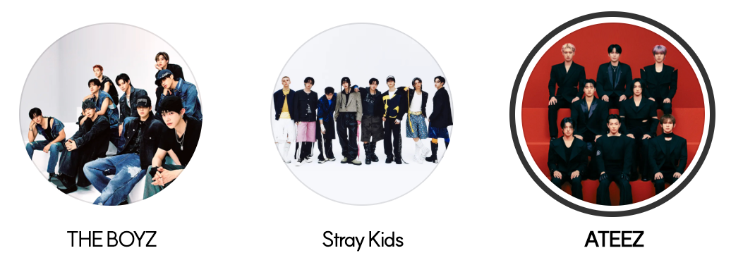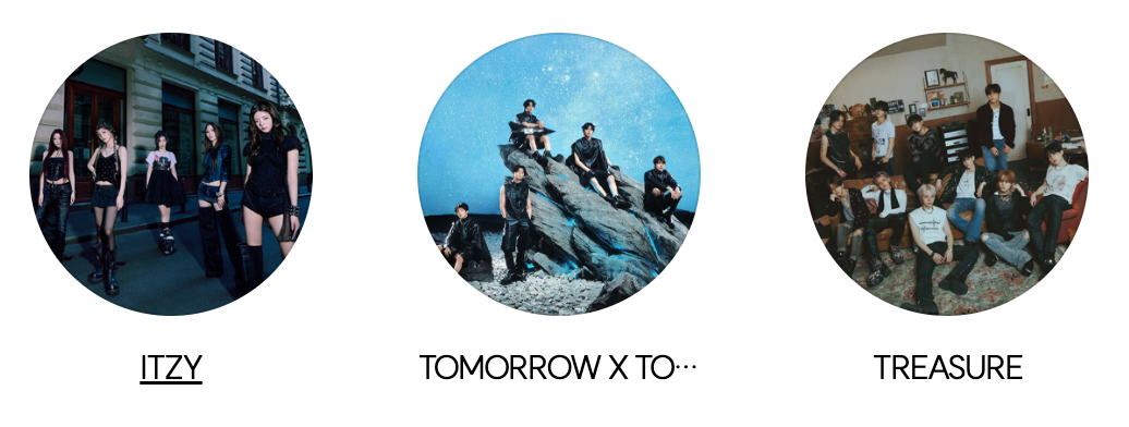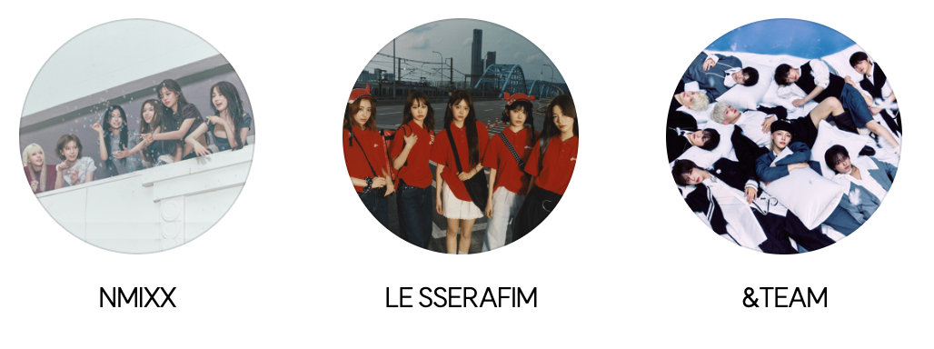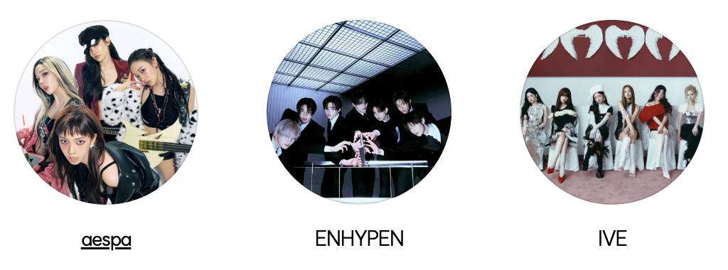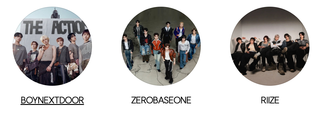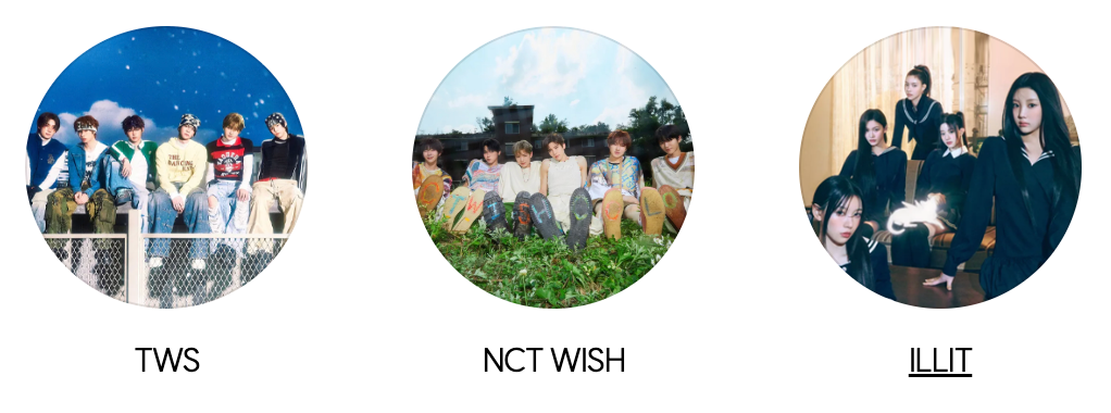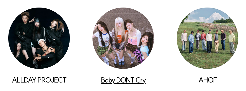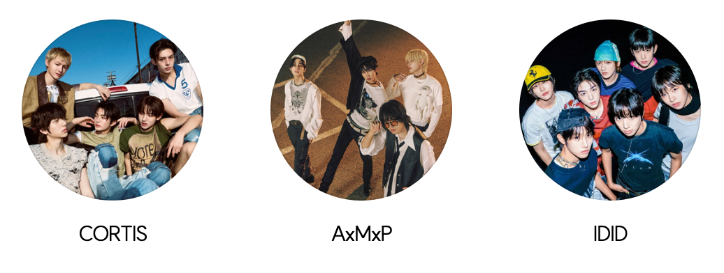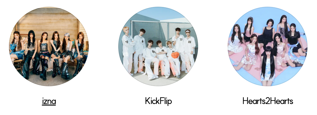 | U-KNOW(유노윤호), KEY(키), CT DREAM, THE BOYZ, Stray Kids, ATEEZ, TOMORROW X TOGETHER, TREASURE, ENHYPEN, &TEAM, BOYNEXTDOOR, ZEROBASEONE, RIIZE, TWS, NCT WISH, BABYMONSTER, NEXZ, ALLDAY PROJECT, CORTIS, AxMxP, IDID, HITGS, SKINZ, KiiiKiii, Hearts2Hearts, Baby DONT Cry, AHOF, MEOVV, KickFlip, izna, ITZY, aespa, IVE, NMIXX, LE SSERAFIM, ILLIT |
