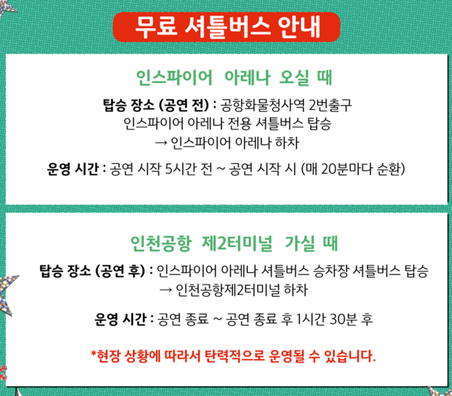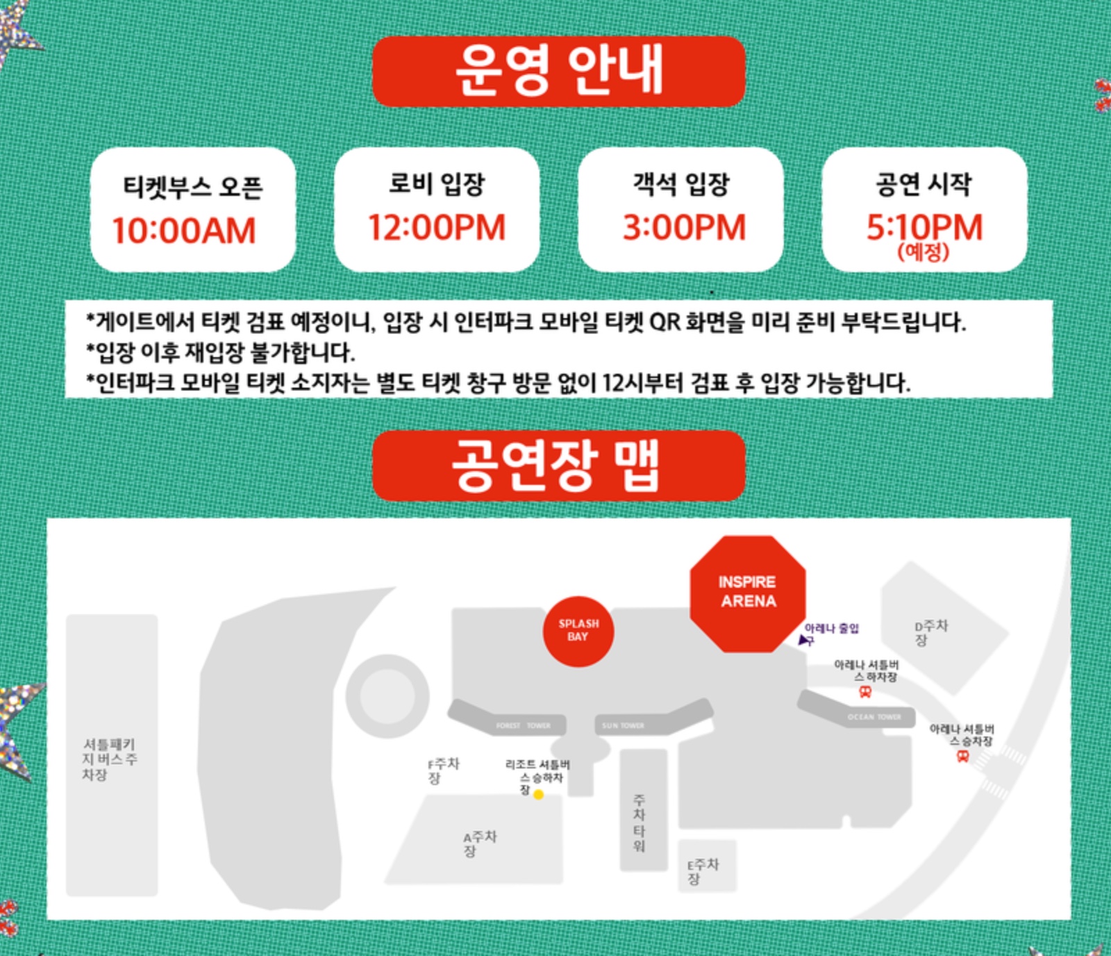 - 공연장 입장 시간이 생각보다 빠르게 열릴 수 있습니다.
