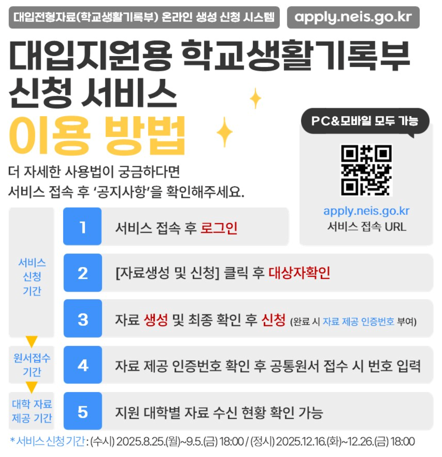 | 정시 | 동일 | 2025.12.16.(화) ~ 12.26.(금) 18:00 | 수시 때 신청해도 정시에 쓰려면 정시 기간에 다시 신청 |