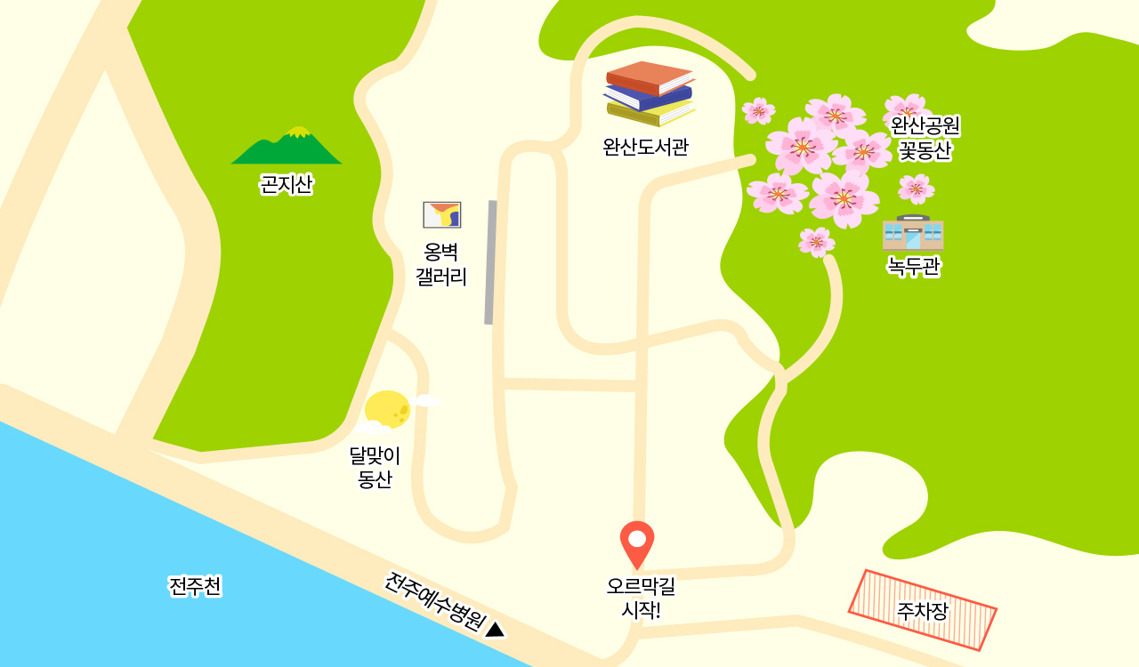 산비탈을 따라 꽃나무가 가득 들어서 있어서 위에서 내려다보는 느낌도 좋고, 아래에서 올려다봐도 꽉 찬 꽃동산 분위기가 잘 살아납니다. 전주 한옥마을과 같이 묶어서 다녀오기에도 괜찮아서 여행 코스로 짜기 쉬운 편입니다.