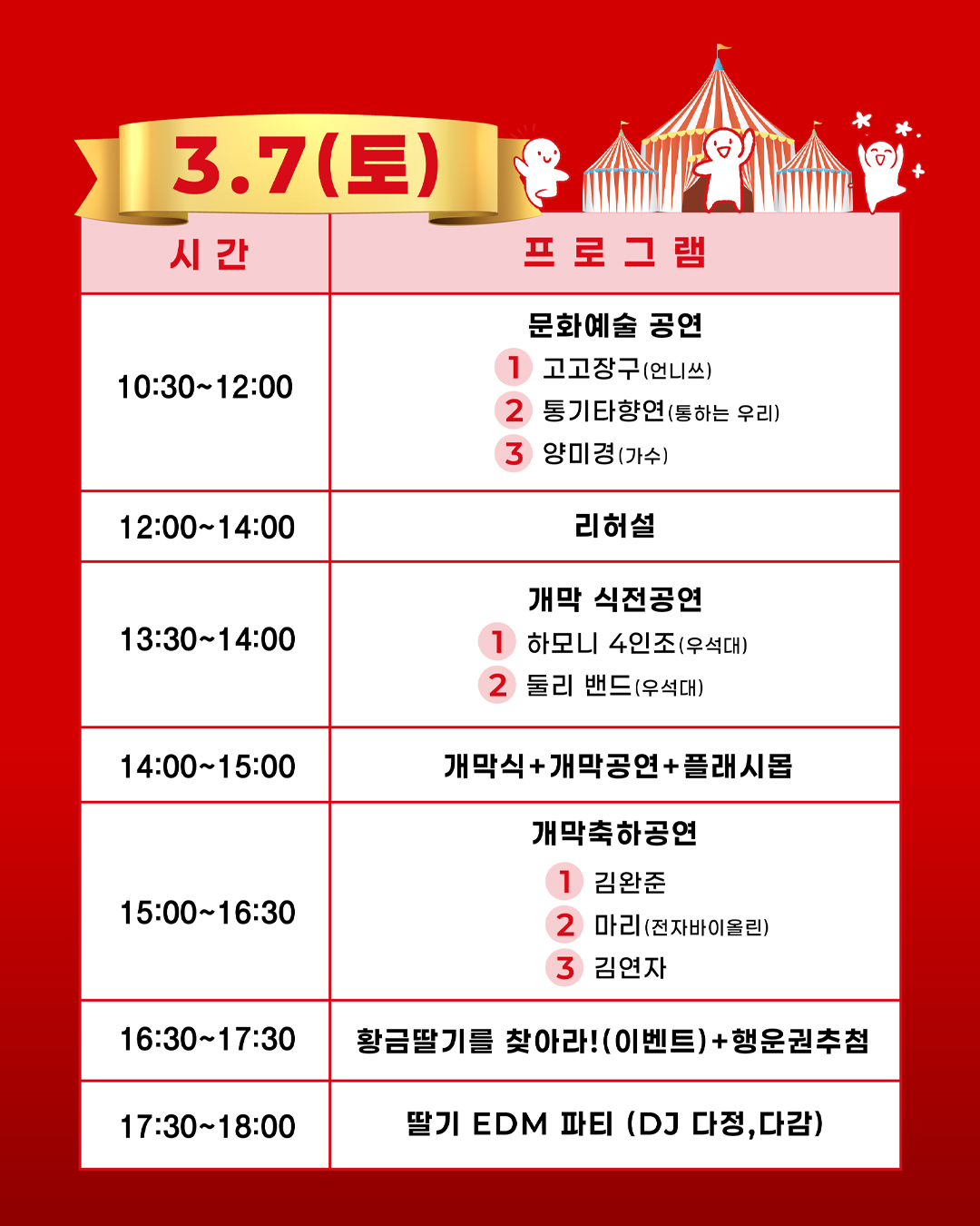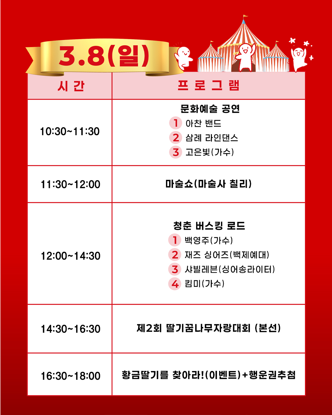 | 16:00 ~ 18:00 | 제2회 딸기꿈나무자랑대회 예선 + 딸기 참여 이벤트 |