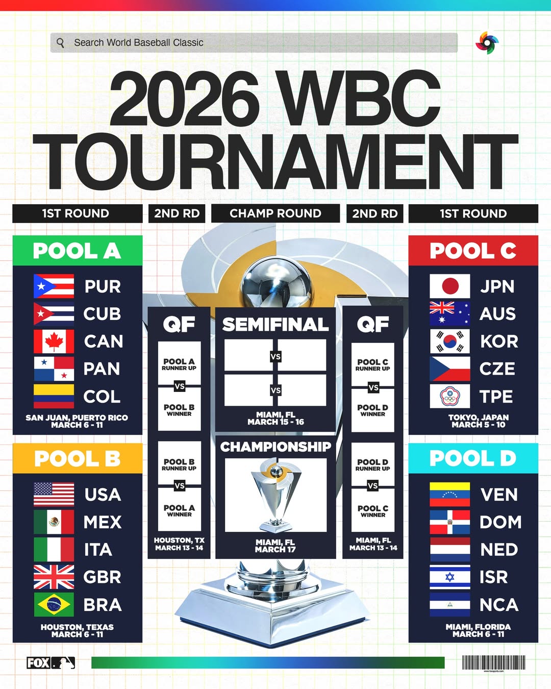 - A·B조 상위 2팀 → 휴스턴 미닛메이드 파크에서 8강(3월 13~14일)